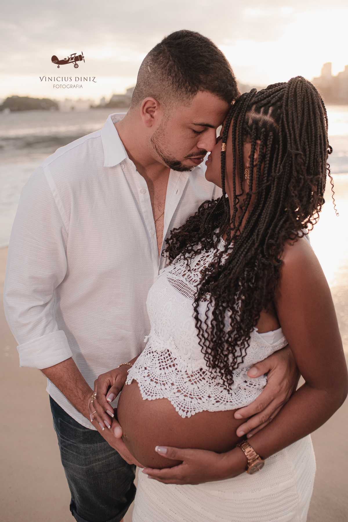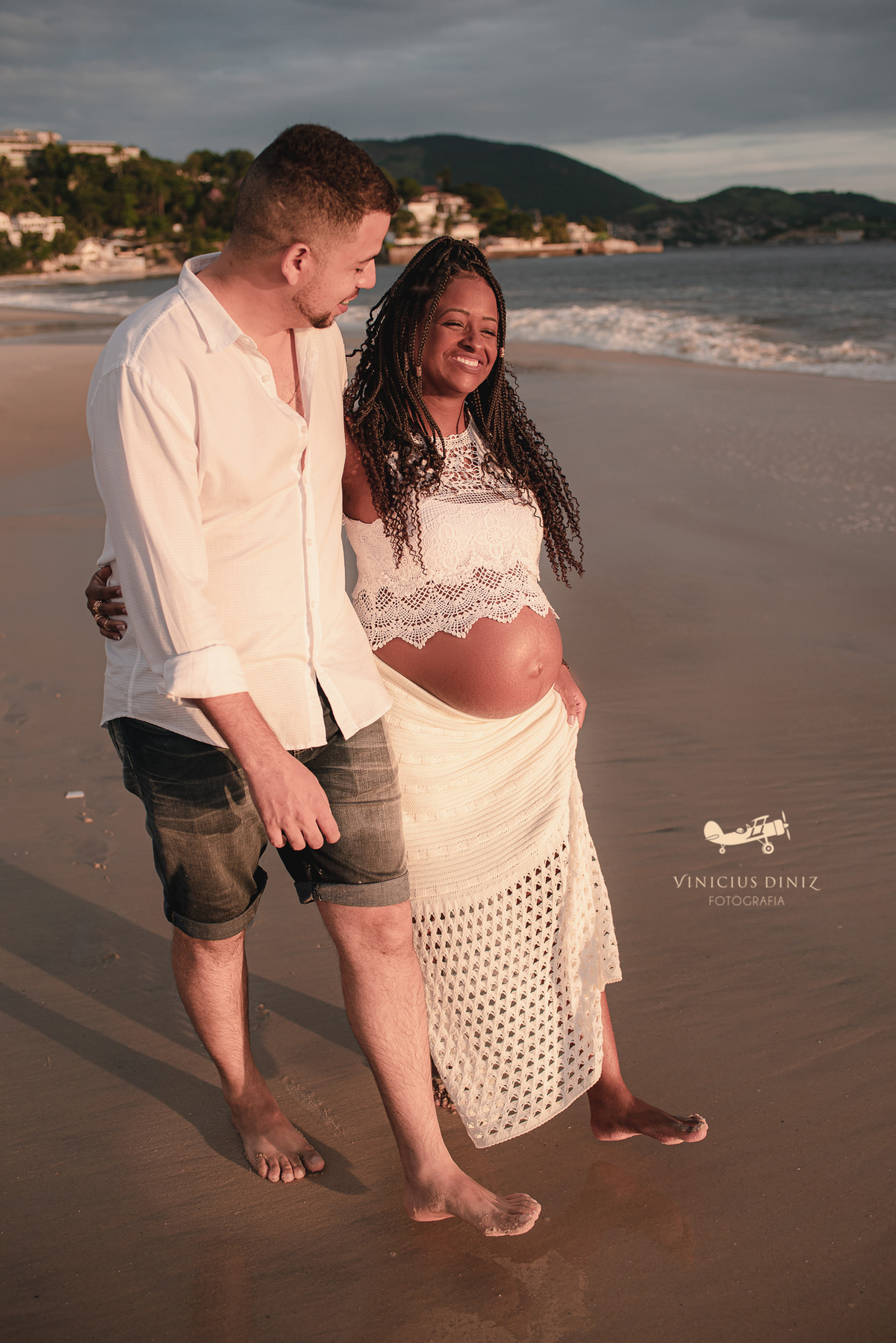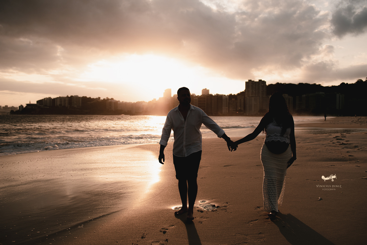 Eles queriam praia e pôr do sol, mas o sol não queria colaborar muito no inicio, mesmo assim começamos a fotografar e eu fiz eles se molharem um pouco (se não se molhar num ensaio assim nem tem graça), então a nossa gestante trocou o figurino e continuamos e no finalzinho do ensaio fotográfico ele deu o ar da graça.... um sol lindo e muito dourado, nem foi preciso muita edição para que as fotos ficassem com esse brilho e essa cor.